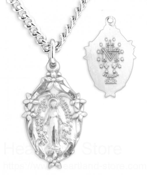 Petite Women's Sterling Silver Miraculous Medal Floral Point Necklace with Chain Options