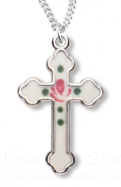 This small Cross made of Sterling Silver has a beautiful white floral enamel center.