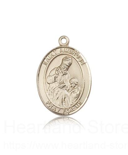 This St. Ambrose Pendant is made of 14 Karat Gold and is approximately the size of a quarter. The jewelry pendant is sold individually and does not come with a chain. All medals are gift boxed in a beautiful blue velvet hinged jewelry gift box.