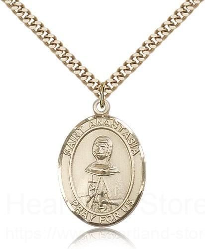 This St. Anastasia Pendant is made of gold filled and is approximately the size of a quarter. The jewelry pendant is paired with a 24 inch gold filled heavy curb chain as pictured. All medals are gift boxed in a beautiful blue velvet hinged jewelry gift box.