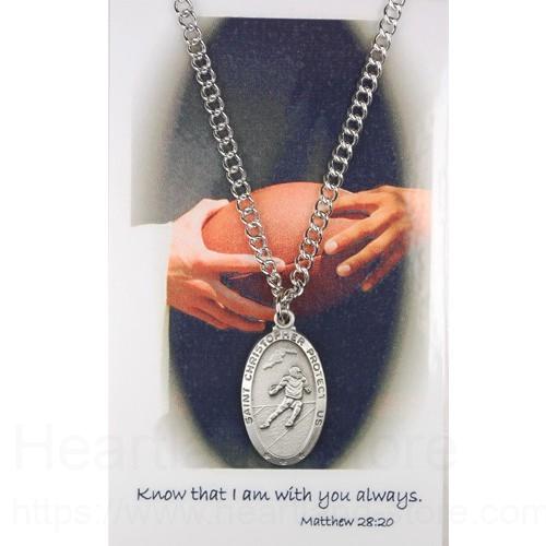 This medal and prayer card set makes for a great gift for the football player. The front of the medal has an image of a boy football player running down the field. Around the raised border the words SAINT CHRISTOPHER PROTECT US.
