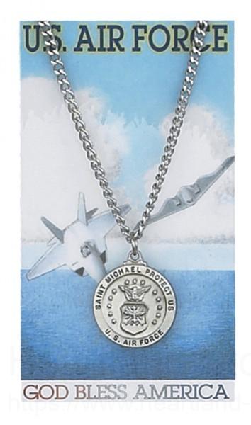 This air force medal is sure to please. This round air force pendant features an image of the Seal of the US Air Force on the front with a strong image of St. Michael as he defeats the devil dragon on the reverse side. The pendant features the following;