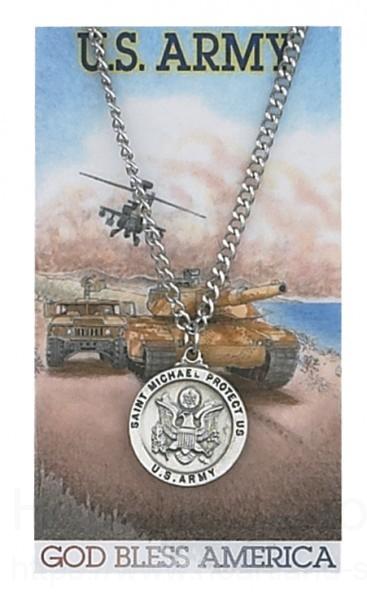 This air force medal is sure to please. This round air force pendant features an image of the Seal of the US Air Force on the front with a strong image of St. Michael as he defeats the devil dragon on the reverse side. The pendant features the following;