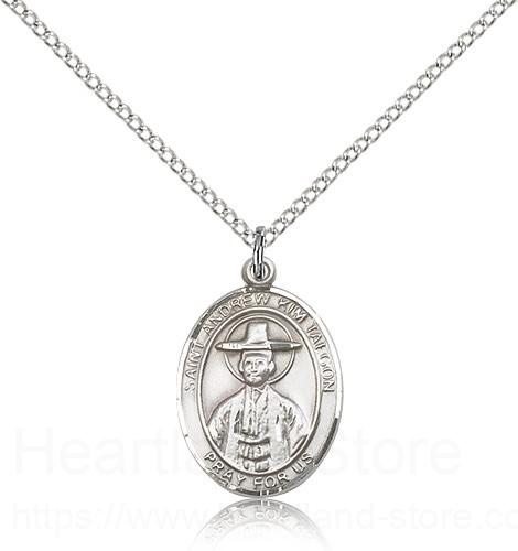 This St. Andrew Kim Taegon Pendant is made of sterling silver and is approximately the size of a nickel. The jewelry pendant is paired with an 18 inch sterling silver light curb chain as pictured. All medals are gift boxed in a beautiful blue velvet hinged jewelry gift box.