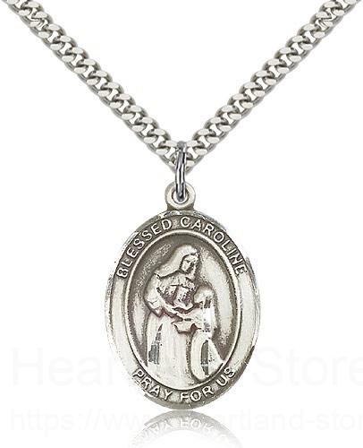 Blessed Caroline Gerhardinger Medal This Blessed Caroline Gerhardinger Pendant is made of sterling silver and is approximately the size of a quarter. The jewelry pendant is paired with a 24 inch stainless steel heavy curb chain as pictured. All medals are gift boxed in a beautiful blue velvet hinged jewelry gift box.