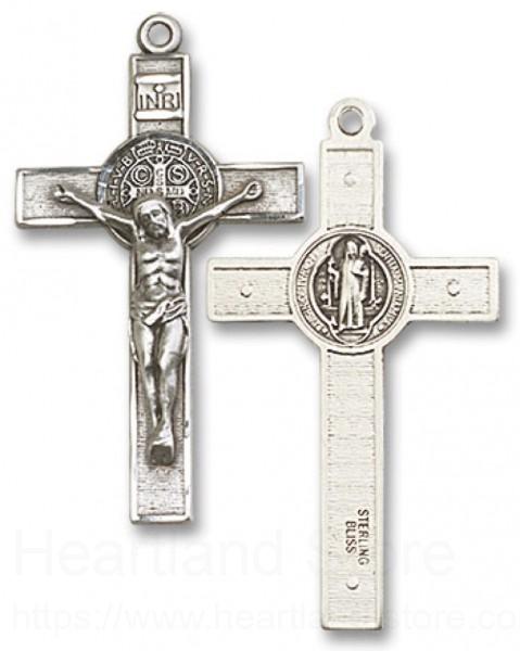 This large decorative .925 Sterling Silver Crucifix Pendant features an image of Saint Benedict on the reverse side.