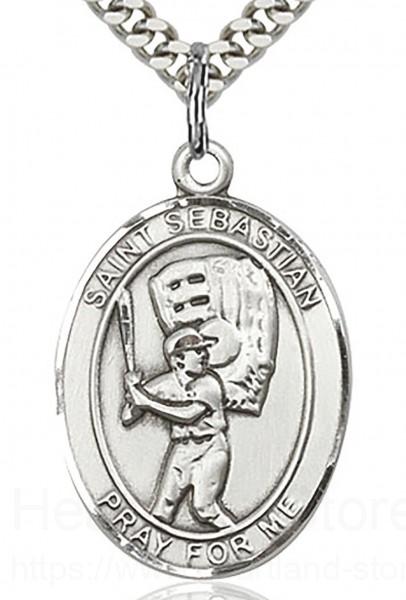 This St. Sebastian Baseball Pendant is made of sterling silver and is approximately the size of a quarter. The medal has a Baseball player on the front, and St. Sebastian on the back.