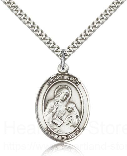 This St. Ann Pendant is made of sterling silver and is approximately the size of a quarter. The jewelry pendant is paired with a 24 inch stainless steel heavy curb chain as pictured. All medals are gift boxed in a beautiful blue velvet hinged jewelry gift box.