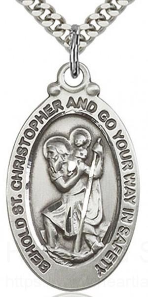 About this St. Christopher Medal, Sterling Silver + 24" 2.4mm Rhodium Plate Chain + Clasp