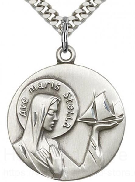 About this Our Lady Star of the Sea Medal, Sterling Silver + 24" 2.4mm Rhodium Plate Chain + Clasp