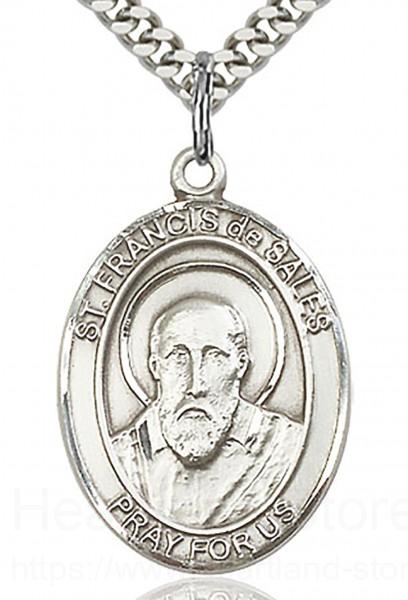 St. Francis De Sales Medal This St. Francis De Sales Pendant is made of sterling silver and is approximately the size of a quarter.