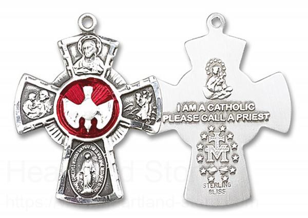 This 5 Way Cross Pendant has a red enameled center, mounted with a Dove.
