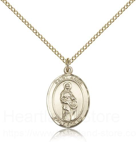 This St. Anne Pendant is made of gold filled and is approximately the size of a nickel. The jewelry pendant is paired with an 18 inch gold filled light curb chain as pictured. All medals are gift boxed in a beautiful blue velvet hinged jewelry gift box.