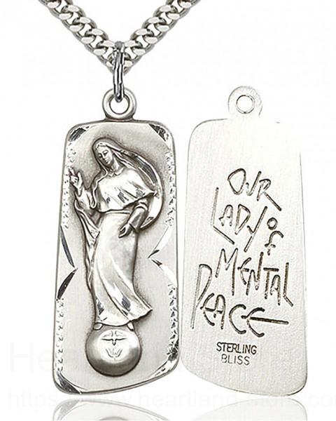 About this Our Lady of Mental Peace Medal, Sterling Silver + 24" 2.4mm Rhodium Plate Chain + Clasp