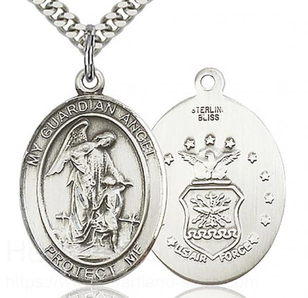 About this Guardian Angel Air Force Medal, Sterling Silver, Large + 24" 2.4mm Rhodium Plate Endless Chain