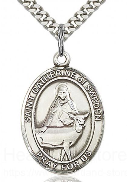 St. Catherine of Sweden Medal This St. Catherine of Sweden Pendant is made of sterling silver and is approximately the size of a quarter.Medal is gift boxed in a beautiful velvet hinged jewelry gift box.
