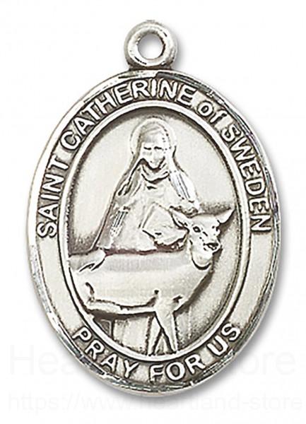 St. Catherine of Sweden Medal This St. Catherine of Sweden Pendant is made of sterling silver and is approximately the size of a quarter.Medal is gift boxed in a beautiful velvet hinged jewelry gift box.
