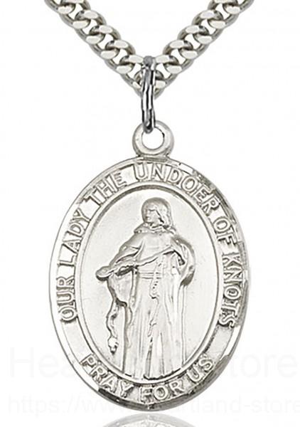Our Lady of Knots Medal This Our Lady of Knots Pendant is made of sterling silver and is approximately the size of a quarter. Medal is gift boxed in a beautiful velvet hinged jewelry gift box.