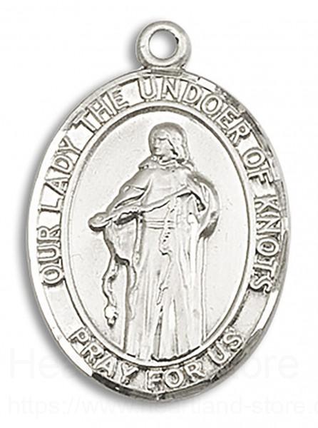 Our Lady of Knots Medal This Our Lady of Knots Pendant is made of sterling silver and is approximately the size of a quarter. Medal is gift boxed in a beautiful velvet hinged jewelry gift box.