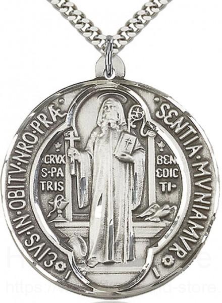 About this St. Benedict Medal, Sterling Silver + 24" 2.4mm Rhodium Plate Chain + Clasp