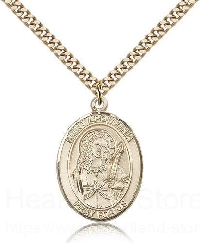 This St. Apollonia Pendant is made of gold filled and is approximately the size of a quarter. The jewelry pendant is paired with a 24 inch gold filled heavy curb chain as pictured. All medals are gift boxed in a beautiful blue velvet hinged jewelry gift box.