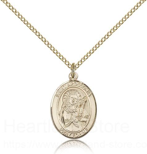 This St. Apollonia Pendant is made of gold filled and is approximately the size of a nickel. The jewelry pendant is paired with an 18 inch gold filled light curb chain as pictured. All medals are gift boxed in a beautiful blue velvet hinged jewelry gift box.