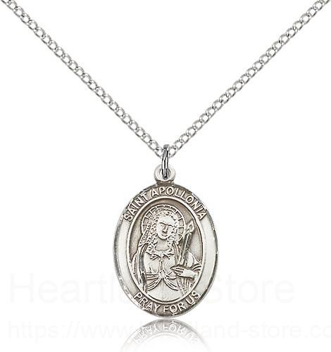This St. Apollonia Pendant is made of sterling silver and is approximately the size of a nickel. The jewelry pendant is paired with an 18 inch sterling silver light curb chain as pictured. All medals are gift boxed in a beautiful blue velvet hinged jewelry gift box.