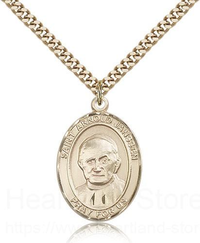 This St. Arnold Janssen Pendant is made of gold filled and is approximately the size of a quarter. The jewelry pendant is paired with a 24 inch gold filled heavy curb chain as pictured. All medals are gift boxed in a beautiful blue velvet hinged jewelry gift box.