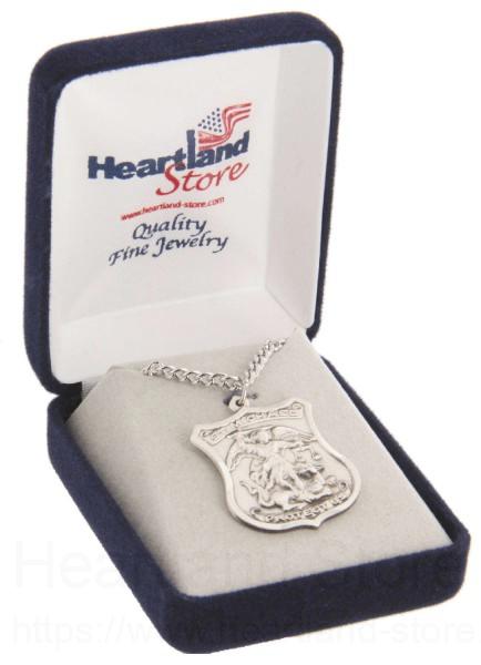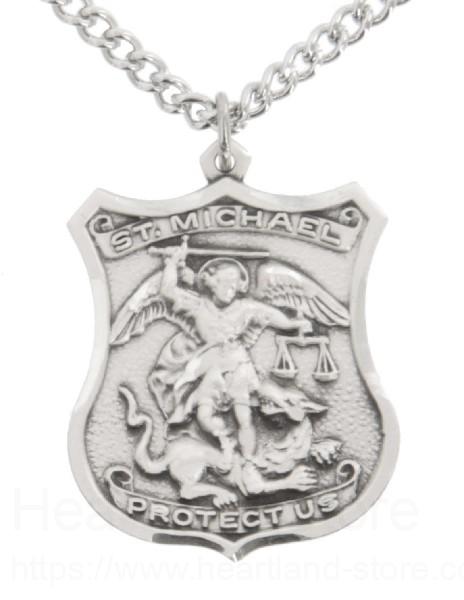 This detailed Saint Michael medal is sized perfectly for a man to wear - it has a pleasing level of detail and relief so that St. Michael stands out very well in this medal. Above him is the label "ST. MICHAEL" and below is "PROTECT US". The overall medal is in the shape of a police shield reflecting that St. Michael is the patron saint of Police Officers. This pendant is an ideal gift for police officers and St. Michael will keep them out of harms way.