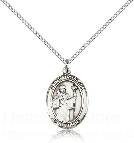 This St. Augustine Pendant is made of sterling silver and is approximately the size of a nickel. The jewelry pendant is paired with an 18 inch sterling silver light curb chain as pictured. All medals are gift boxed in a beautiful blue velvet hinged jewelry gift box.