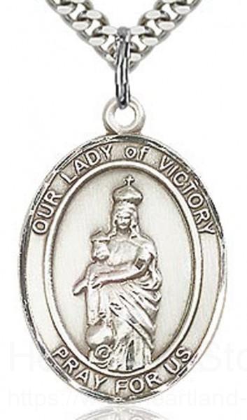 About this Our Lady of Victory Medal, Sterling Silver, Large + 24" Sterling Silver Chain + Clasp