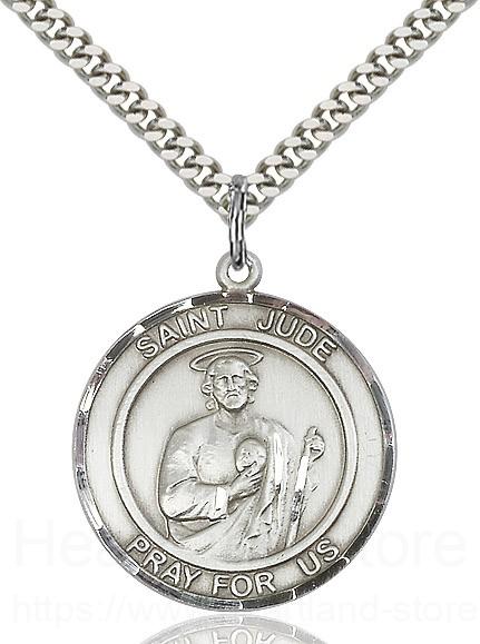 This is a larger round sterling silver patron saint medal of St. Jude. Featuring "SAINT JUDE PRAY FOR US" around the edge and an image of Saint Jude in the middle.