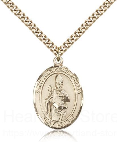 This St. Augustine of Hippo Pendant is made of gold filled and is approximately the size of a quarter. The jewelry pendant is paired with a 24 inch gold filled heavy curb chain as pictured. All medals are gift boxed in a beautiful blue velvet hinged jewelry gift box.