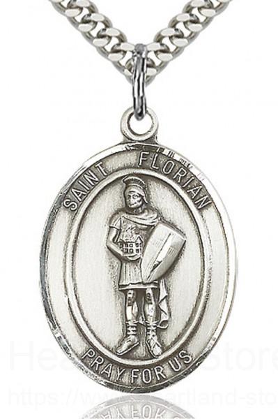 St. Florian Medal This St. Florian Pendant is made of sterling silver and is approximately the size of a quarter.