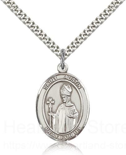 This St. Austin Pendant is made of sterling silver and is approximately the size of a quarter. The jewelry pendant is paired with a 24 inch stainless steel heavy curb chain as pictured. All medals are gift boxed in a beautiful blue velvet hinged jewelry gift box.