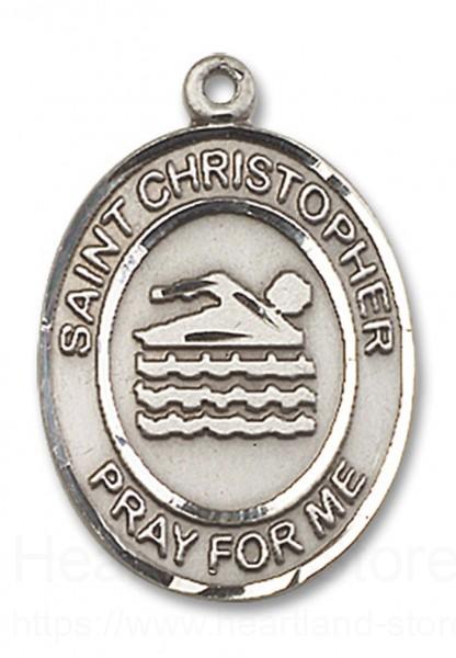Saint Christopher Swimming Pendant is made of sterling silver and is approximately the size of a quarter.