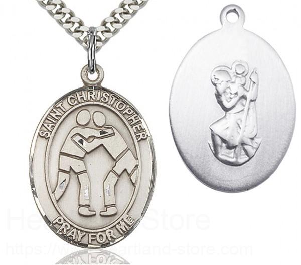 St. Christopher Wrestling Medal, Sterling Silver, Large + 24" 2.4mm Rhodium Plate Endless Chain