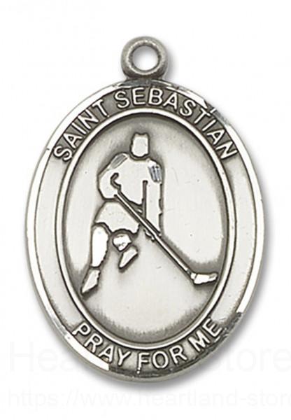 Saint Sebastian Ice Hockey Pendant is made of sterling silver and is approximately the size of a quarter.