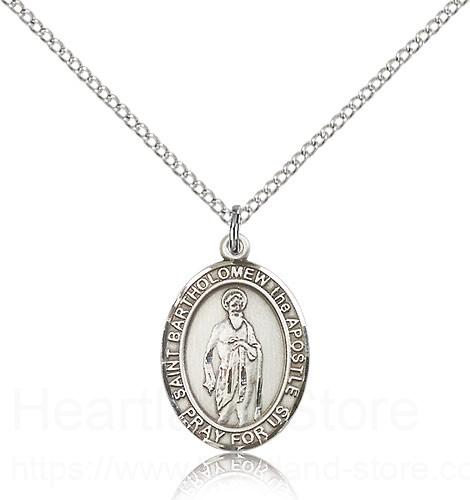 This St. Bartholomew the Apostle Pendant is made of sterling silver and is approximately the size of a nickel. The jewelry pendant is paired with an 18 inch sterling silver light curb chain as pictured. All medals are gift boxed in a beautiful blue velvet hinged jewelry gift box.