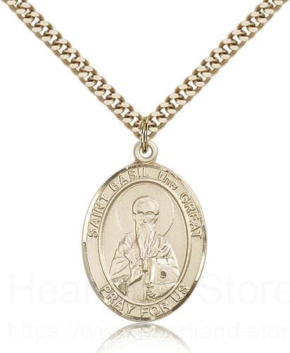 This St. Basil the Great Pendant is made of gold filled and is approximately the size of a quarter. The jewelry pendant is paired with a 24 inch gold filled heavy curb chain as pictured. All medals are gift boxed in a beautiful blue velvet hinged jewelry gift box.