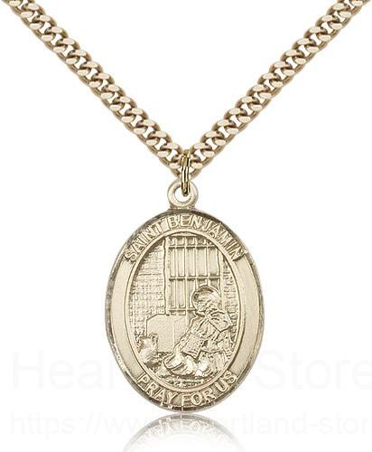 This St. Benjamin Pendant is made of gold filled and is approximately the size of a quarter. The jewelry pendant is paired with a 24 inch gold filled heavy curb chain as pictured. All medals are gift boxed in a beautiful blue velvet hinged jewelry gift box.