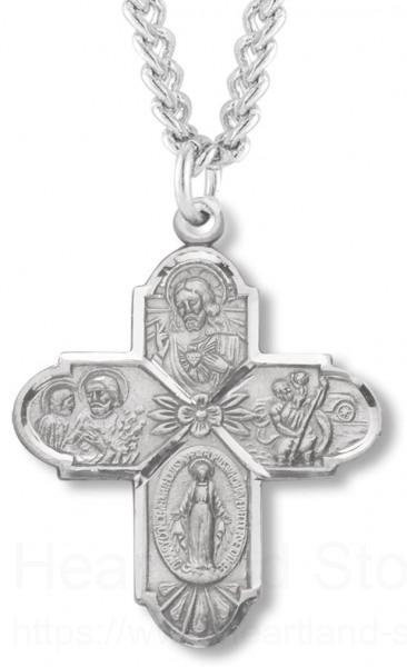 A men's 4-Way pendant with wide budded tips allowing great detail in the four images of Jesus, Mary, St. Christopher and St. Joseph. In the center is a small petal accent flower.