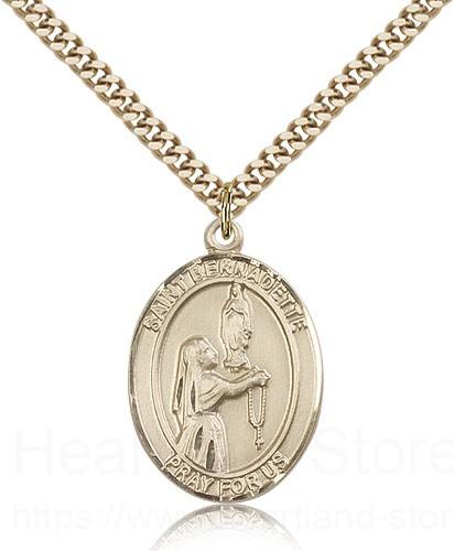 This St. Bernadette Pendant is made of gold filled and is approximately the size of a quarter. The jewelry pendant is paired with a 24 inch gold filled heavy curb chain as pictured. All medals are gift boxed in a beautiful blue velvet hinged jewelry gift box.