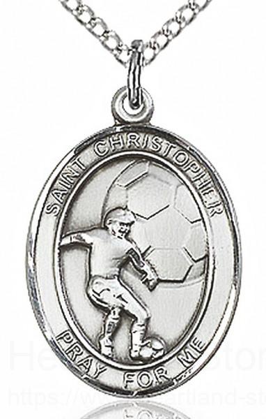St. Christopher Soccer Medal This St. Christopher Soccer Pendant is made of sterling silver and is approximately the size of a dime. The jewelry pendant is paired with a choice of chain options. All medals are gift boxed in a beautiful blue velvet hinged jewelry gift box.