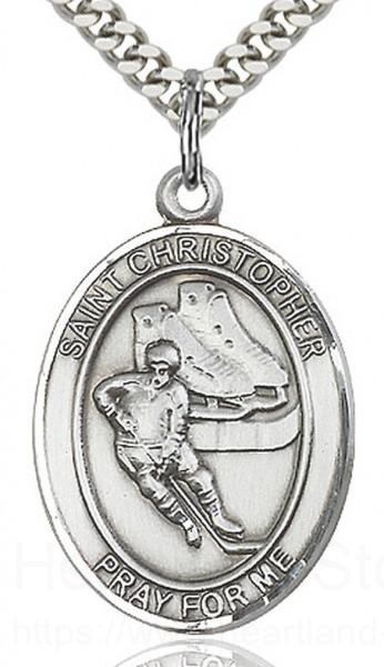 St. Christopher Hockey Medal This St. Christopher Hockey Pendant is made of sterling silver and is approximately the size of a dime. The jewelry pendant is paired with a choice of chain options. All medals are gift boxed in a beautiful blue velvet hinged jewelry gift box.