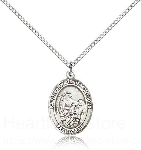 This St. Bernard of Montjoux Pendant is made of sterling silver and is approximately the size of a nickel. The jewelry pendant is paired with an 18 inch sterling silver light curb chain as pictured. All medals are gift boxed in a beautiful blue velvet hinged jewelry gift box.