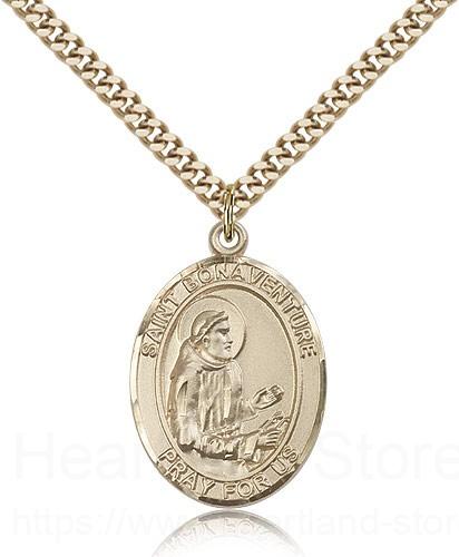 This St. Bonaventure Pendant is made of gold filled and is approximately the size of a quarter. The jewelry pendant is paired with a 24 inch gold filled heavy curb chain as pictured. All medals are gift boxed in a beautiful blue velvet hinged jewelry gift box.