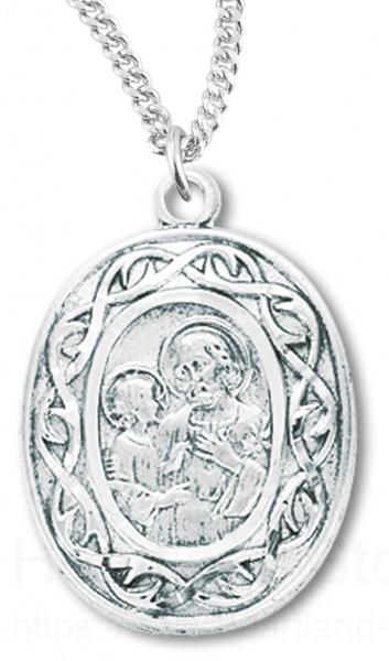 In the center of the medallion is Saint Joseph lovingly holding the Christ Child. The thick border is designed with a crown of throns motiff. Ideally sized for a woman or younger person.