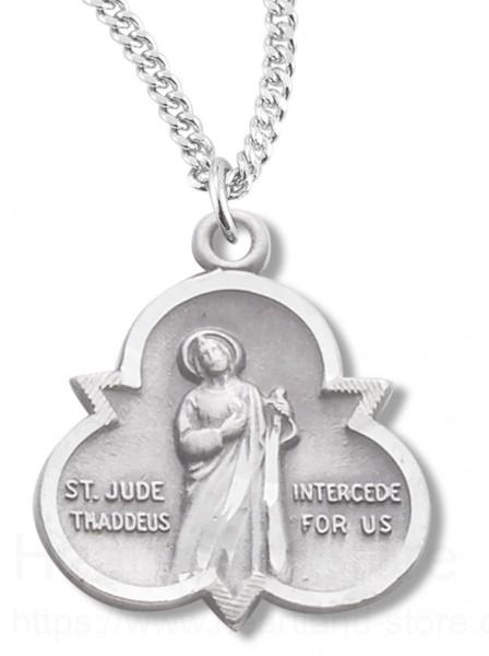 A woman's Saint Jude with an image of the saint in the center and a wide tip clover shape. Text reads SAINT JUDE THADDEUS PRAY FOR US.