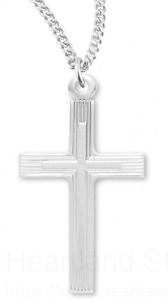 A pretty woman's cross necklace with a slimline cross on cross design. The cross background has a ribbed texture for visual interest.